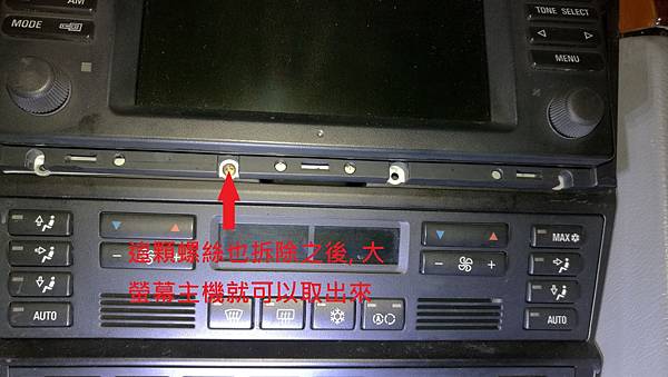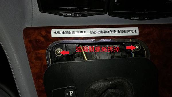 置物盒取下來之後, 前面有兩顆螺絲要拆掉, 另外在排檔桿的前面還有另外兩個螺絲, 拆除之後才能把整片中船的核木飾板拆下來, 前面的螺絲藏在排檔座下面, 拆除方式請看下面照片: