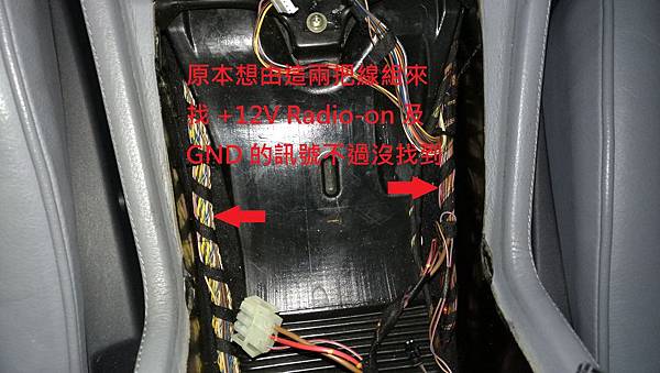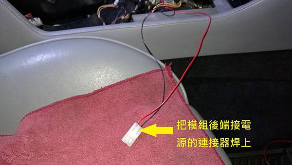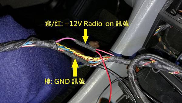 要接線之前要先由下方把線穿上來, 這個說來簡單, 不過也花了一些時間, 用個鐵絲會比較好穿一些, 穿好之後就可以焊接了, 這部份就沒什麼學問, 紫/紅這條是+ 12 V Radio-on, 棕色這條是GND, 如下: