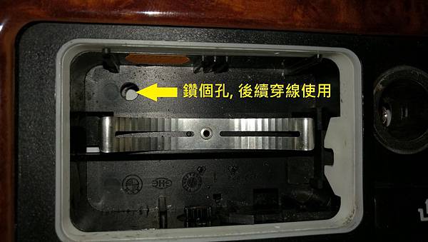 因為我們的模組要放在原本煙灰缸的地方, 這邊要走電源, 所以要鑽個洞, 如下:
