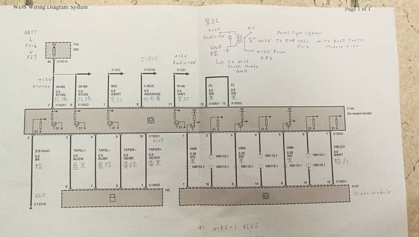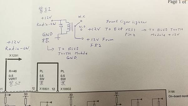 最後附上電路圖, 原本想把點煙器電源也改為開紅火才有電, 不過這次時間不夠, 下次再來施工, 但是電路圖上有畫就是了, 請參考: