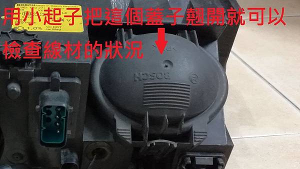 前一陣子有看到友站的車友們在討論魚眼大燈的問題, 正好我的B12 上面就有HID的魚眼大燈, 所以想來給他進化一下, 弄個LED光圈再加上遠近可切換的HID魚眼來使用, 因為B12車上的燈狀況還OK, 而且整理及改裝須要花一些時間, 所以由回收場找了一組後期的HID大燈來整理, 這樣才不會影響我日常用車, 東西到手之後先檢查一下大燈的狀況, 我最在意的是大燈內部的線組, 所以先翹開大燈後方橢圓形的蓋子就可以看到內部線組的狀況, 如下圖: