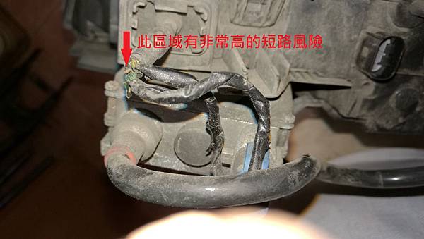 雖然由大燈的外觀看起來就沒有太高的期待, 但是看了內部之後還真的是嚇一跳, 如下圖, 這個是拆下來之後拍的, 反正狀況很嚴重就是了, 建議車友們有空自己檢查一下, 避免電線短路的風險:
