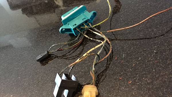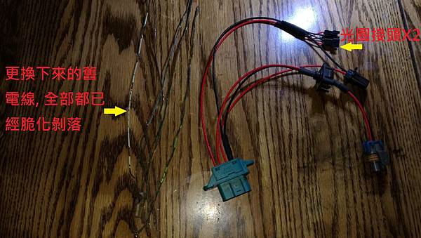 換好之後的線組如下圖, 可以看到有多兩個光圈的Connector, 但遠近燈切換的接頭還沒焊上去, 旁邊是換下來的舊線: