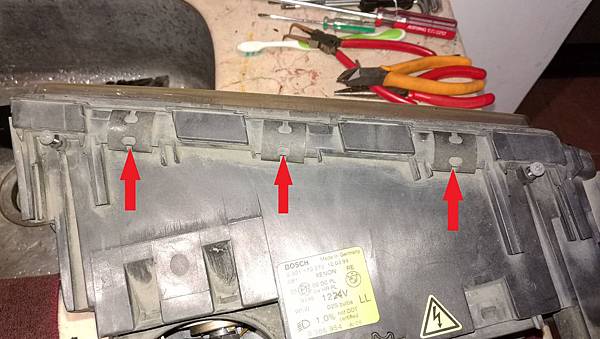 接下來拆固定大燈外殼的卡簧, 上面三個: