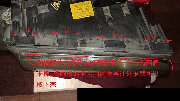 大燈上方有個防水膠條要取下來, 老車這部份大多已經損壞, 須要更換新品, 拆除的方式如下方照片: