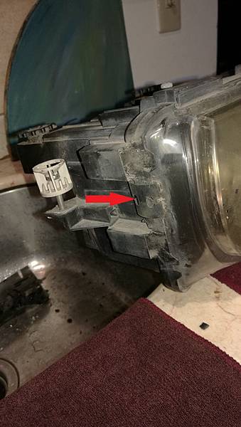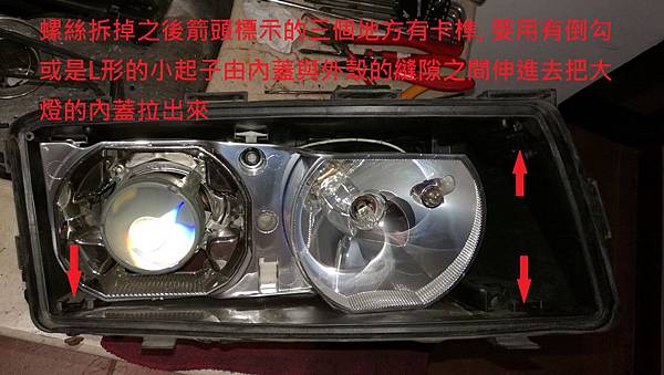 接下來就可以把大燈的外殼取下來了, 取下之後要繼續拆內蓋, 有個小螺絲要先拆掉, 如下圖: