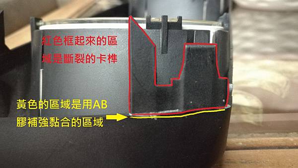 說到這個內蓋, 因為三邊的卡榫都非常薄, 尤其是上一張照片右上角的那個卡榫, 非常容易斷, 這個大燈的狀況也不例外, 因此須要做修補, 我的修補方式是用AB膠先固定, 等膠乾了之後, 再用個細鐵絲(或是迴紋針), 彎成一個大的U形, 用烙鐵把這個補強用的鐵絲壓入塑膠內部, 這樣就不會再斷裂了, 如下面兩張照片: