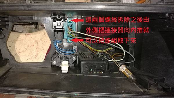 總成取出來之後就可以看到線組, 兩個固定螺絲拆掉, 由大燈外側把連接器向大燈內側推, 就可以把整個線組取出來: