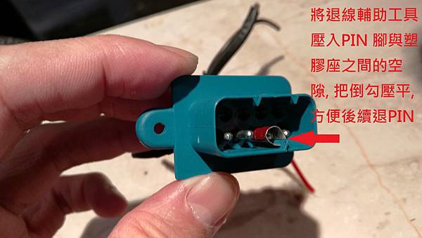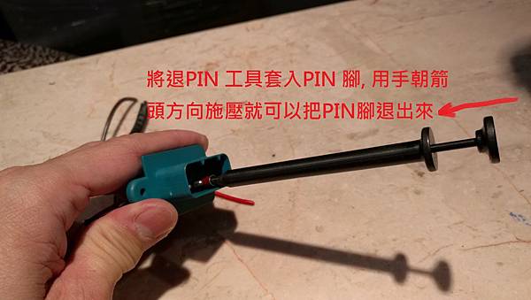 再把退PIN工具前端的孔位對準PIN腳, 同時用手壓後方的把手就可以把PIN腳壓出來: