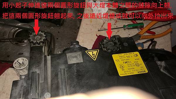之後要把調整左右及高低的旋鈕翹起來, 整個遠近燈的總成件就可以取出來:
