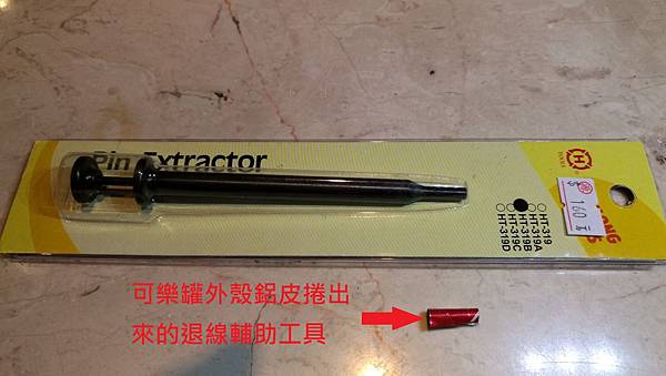 接下來就是要來退PIN 更換線材, 找到的退PIN 工具如下, 不過它的尺寸還是有點小小的不合, 所以須要一個輔助的工具, 是用可樂罐的鐵皮捲出來的, 等一下會說明如何使用: