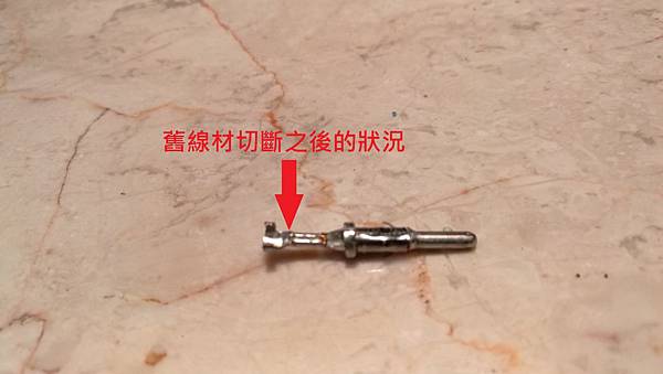 壓出來之後先把舊的線拆下來, 用小隻尖嘴鉗把後端固定線材的鐵片扳開, 再把舊線直接切斷, 之後換上新線, 用後端的小鐵片固定壓緊, 前面的線頭再用烙鐵焊接到PIN腳本體上就萬無一失了, 照片如下: