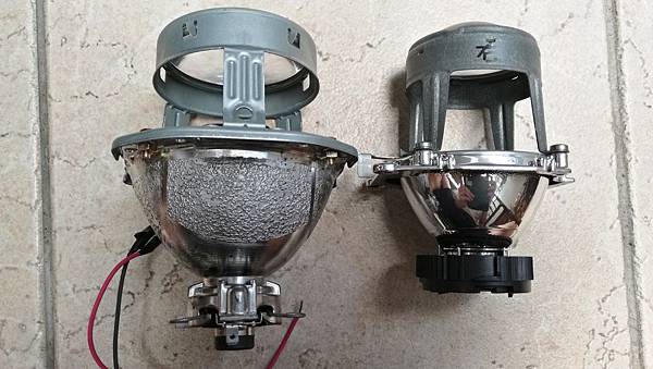 光圈安裝完畢之後再來就是重頭戲, 要把原廠的HID魚眼更換為遠近切換的魚眼, 我用的零件是Lancer Fortis 車上使用的遠近切換的魚眼, 這個也是在露天上面找到的, 不太好找, 可能要去回收場自己拆, 下面是兩個魚眼大小的比較, 我已經把BMW原廠的魚眼拆下來, 右邊是BMW 原車的魚眼, 左邊是遠近切換的魚眼, 可以看到燈杯的部份大上不少, 魚眼透鏡也比較大顆: