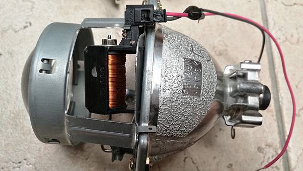 下面這張是鎖上去之後的照片, 這個角度可以看到切換遠近燈的電磁閥, 裝上去之前要把魚眼用酒精擦乾淨, 這樣大燈才會夠亮: