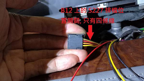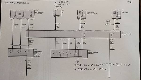 測試之後正常, D檔為Low, 其他檔位是High. 至於我說的小問題, 就是發現B12車上的S227 排檔位置開關竟然少一條線, 但還是可以動, 副作用是進M/S mode時原本的D檔LED也會亮, 不過我覺得也是一種指示的方式, 所以沒有再深入研究了.