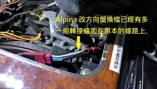 由照片中可以看到方向盤的左右各有個箭頭的標示, 其實按鍵是做在反面, 因此可以直接在方向盤上面操作升降檔, 既然Alpina 原廠就已經把方向盤換檔的功能都已經做好了, 那我們還要改裝什麼東西呢? 因為Alpina 原廠的設計這個方向盤上的按鍵是須要與排檔桿來搭配使用的, 也就是說要使用方向盤上的換檔按鍵之前必須先手動把排檔桿向左方撥, 切入M/S Mode 之後才能在方向盤上控制升降檔, 這整個操作的方式我是覺得只做了半調子, 應該有改進的空間, 我的想法如下:
