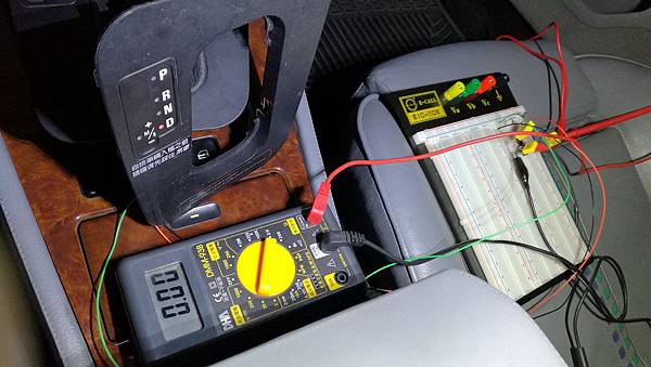 接下來要量另一個訊號, 因為我們要判斷目前是否在D檔, 因此D檔的燈號我們須要轉換一下送進我們的線路, 先用回收場拆的面板, 由X1599 PIN5 焊線出來接到我們在麵包板上的線路, 看看動作是否正常, 如下: