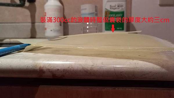 用針筒將兩個囊袋都裝300cc 的冷卻液準備壓力測試: