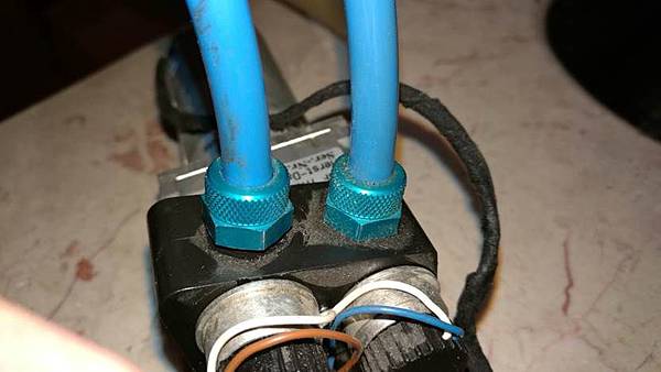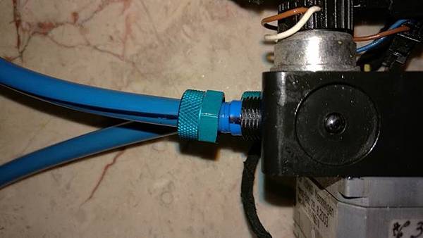 下面是囊袋的塑膠管接頭, 用14號的板手就可以拆開, 這個是還沒拆的狀況
