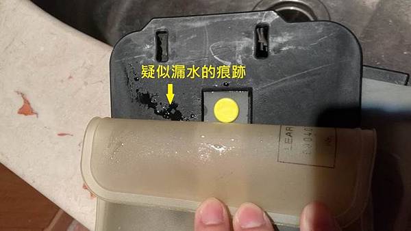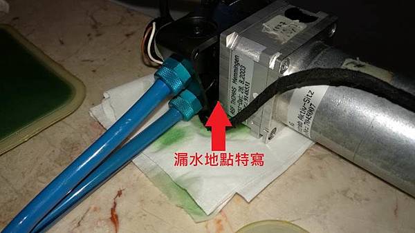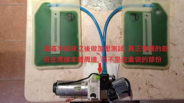 為了確保液體不會由管頭的部份漏出來, 那個管頭的螺紋可以用修水龍頭用的止水帶先纏一下, 壓力測試也很簡單, 用兩手在兩個囊袋上施壓, 把上半身的重量壓在囊袋上, 這樣壓個5~10分鐘應該就可以模擬真實上車的狀況, 因為上車時是駕駛的體重壓在上面, 下面是壓完之後的結果, 可以明顯看到, 囊袋完全沒有漏, 冷卻液漏出來的地方是在馬達的本體與塑膠接合的部份