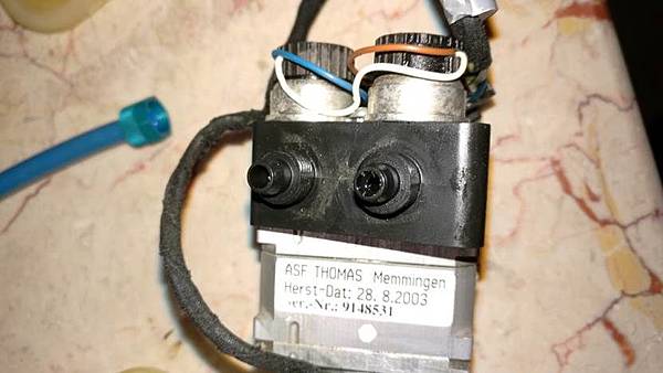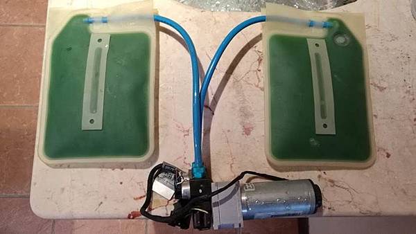 為了解決這個疑似漏水的問題, 所以由EBay 上買了一組E65/66 用的主動座椅模組回來研究, 原本是想說如果模組可以互換那就直上, 不過東西到手的時候有比對了一下, 差異點有二, 一個是壓力感應器 E65/66的是兩線, E38的是三線, 另外馬達的部份E65/66是兩線, E38 是五線, 差異還蠻大的, 沒有辦法直接互換, 所以只能退而求其次, 看囊袋是否可以使用, 不過這個Ebay的模組到手的時候兩個囊袋內的液體都是近乎完全空空的狀態, 也不知道是囊袋有漏還是模組當中什麼地方有漏, 所以就先來研究一下, 想法是只要囊袋沒有問題, 我們就把沒有漏水的囊袋搬過去就可以了, 所以要先證明這個買回來的囊袋到底是可用還是不可用, 實驗的方式是把囊袋先由塑膠管的接頭部份拆開, 之後灌冷卻液進去, 再把管頭鎖回去, 再來針對兩個囊袋的部份加壓, 看看是否有漏水, 之所以選用冷卻液一方面是綠色的液體如果有漏比較容易看出來, 還有就是原廠灌的液體也是類似的成份, 主要是要防凍, 雖然在台灣應該不會有這個狀況, 但我還是用冷卻液來做實驗這樣比較容易看, 接下來的照片只要看到藍色塑膠管連到馬達那端的座子是黑色塑膠的就是E65/66的主動椅模組, 是銀色鋁料的就是E38的模組, 其實只有前面兩張與最後一張是E38的其餘都是E65/66的.