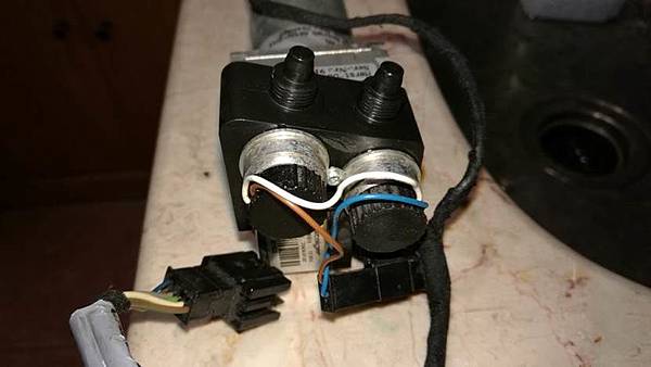不過既然已經開始做實驗, 我們就把這個E65/66 的模組研究一下, 看到底是什麼地方在漏, 說不定可以來修一下, 要拆之前先拍幾張照片, 避免之後裝不回去, 下面是兩個壓力偵測的感應器, 照片中有兩個圓型有黑色蓋子的就是, 這個新版的每一個只有兩條線, 舊版的(E38用的)每一個有三條線, 如下圖:
