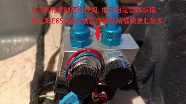 這邊也有兩個O-ring, 也是有可能會漏水的地方, 如果是E65/66的車主應該可以自己DIY, 這樣就不用更換整個模組了, 之前有查過E38的主動座椅模組, 就兩個囊袋加上馬達是一整組的, 目前還有貨, 單邊一組合USD 1168, 這個錢應該沒有E38的車主花的下去, 不知道後期的E65/66的模組多少錢, 如果有漏這四個O-ring 換掉應該就可以回春, 也可以省不少錢, 另外下面這張是E38 上面的主動座椅模組的照片, 可以看到圓形的壓力感應器是三線的: