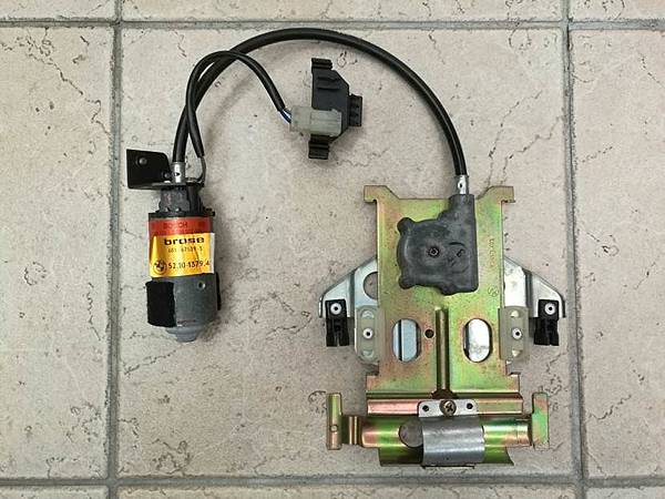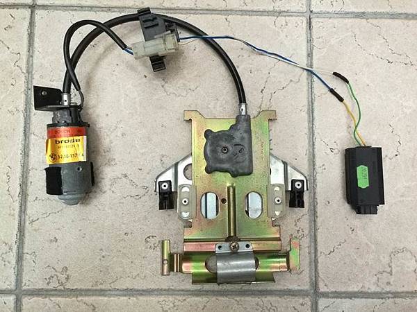 這個黑盒子把馬達在轉動的時候電流的脈衝訊號轉換過之後送給我們在調整座椅位置的開關, 就是照片中下面那個零件, 這個內部有電路會算馬達是正轉還是反轉, 轉了多少圈, 因此當我們按下記憶功能鍵他才知道要轉到什麼地方停止, 因此照說只要馬達本身的規格差異不大, 我們應該有機會可以延用相同的控制方式到E65/66的座椅上面, 因為座椅是否好坐與座椅的形狀設計及材料比較相關, 與馬達的控制方式應該無關, 因此今天的實驗就是要來驗證這個想法是否可行, 但E65/66的座椅還沒到手, 所以先用E34的頭枕馬達模組來替代一下, 下面是E34的頭枕上下移動的模組, 全金屬的感覺比E38還要耐用: