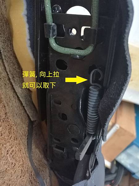 這兩張座椅原本的顏色是藍色的, 因為E34車輛的內裝應該是黑色的居多, 而且我手上E38的椅背也都是黑色的, 所以皮面的部份要來修改一下, 先測試一下座椅的功能, 這張座椅問題不少, 有兩顆馬達不會動作, 還有兩條傳動的鋼纜因為外套管拉伸所以有單邊傳動不良的狀況, 所以先把這個部份處理一下, 要處理之前首先把坐墊及椅背的部份先分開會比較好施工, 先把椅背的背板拆下來, 用力向上及向後拉就可以取下來, 再來左右兩側有個固定卡勾的彈簧要取下來, 如下圖位置:
