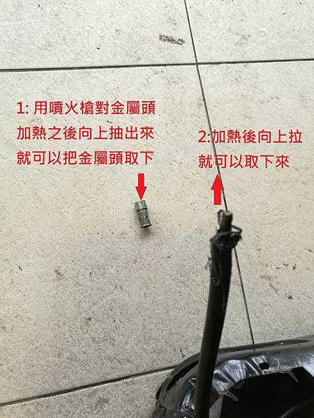 接下來處理鋼纜的問題, 有問題的鋼纜分別是負責椅背傾斜及頭枕的高度, 之所以會傳動不良主要是纜線外面的塑膠套管用久了之後長度被拉長, 造成內部的鋼纜沒有辦法扣到傳動的組件造成空轉, 處理的方式也很簡單, 用噴火槍把傳動鋼纜的金屬頭加熱之後抽出來, 再把纜線的塑膠套管剪短, 之後再把金屬頭加熱之後套回去就可以, 照片如下: