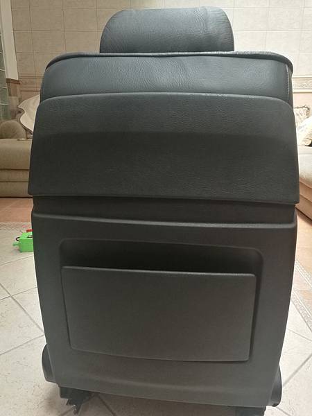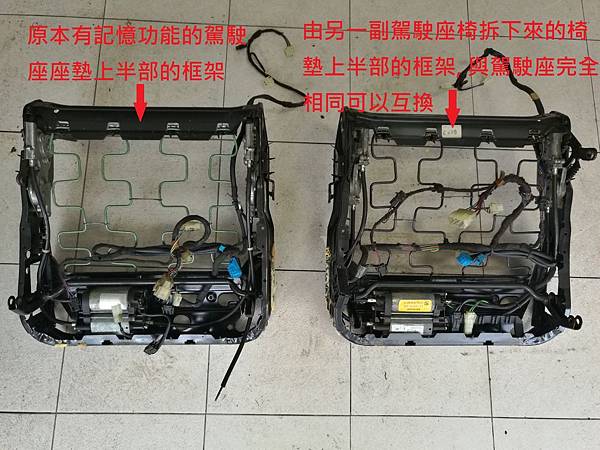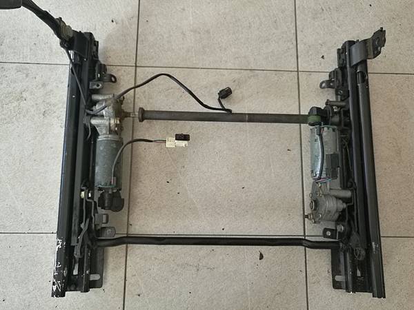 要移那個可變電阻很簡單, 旁邊四個卡勾移動一下就可以拆下來, 再移到另一個馬達上面就可以, 移完之後裝回軌道上, 這個處理完畢之後整個電動椅的各個動作都已經正常了, 不過這邊講的正常是指直接供電給馬達, 所有的動作都正確, 表示機構與馬達相關的問題已經都解決了, 這個部份處理好就要來把坐墊的上半部與下半部再組合起來, 結果這時候出了個狀況, 我想應該是當初這兩張座椅的保存狀況沒有很好, 也許是搬運過程有受到撞擊, 或者是座椅傳動的鋼纜有損壞導至座椅前端長時間歪斜, 所以前端的支撐腳有變形, 造成四個圓形的卡筍只能上三個, 最後一個孔位差距有超過兩公分以上, 完全沒有辦法組裝, 所以只好再來做個苦工, 拿另外一個座椅椅墊的上半部來移植, 須要移植所有的馬達, 因為有記憶功能的座椅每一個馬達上面都有一組可變電阻來傳送馬達的位置資訊, 這邊說的簡單, 但換起來是大工程, 還好單就座椅椅墊的上半部是沒有左右邊的分別的, 正駕與副駕是可以通用, 因此我拆了另一張副駕駛座座墊的上半部的鐵框, 把原本有記憶功能的馬達全部移過來, 也順便把座椅的皮面換成黑色的, 照片如下: