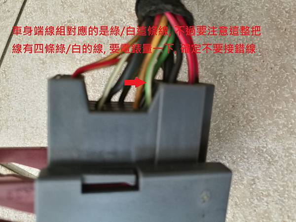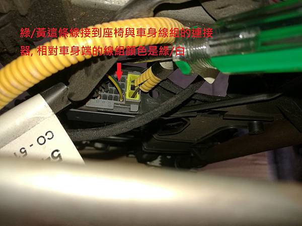 就是圖中H29-2的接頭 PIN 1:接+12V, PIN 2 & 29: 要接地就可以動作了, 電源線有經過一個繼電器, 這個繼電器有一個控制線要接地才會ON, 這條控制線是綠色黃色的, 車身端點接線的顏色是綠色白色, 因此這條線要接地才會供電, 所以照下圖的接法椅子就可以調整了, 請看相關的照片:
