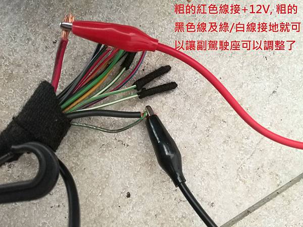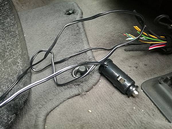 所以前面說這個是苦工,因為總共要拆掉四張座椅,才能把原本皮面狀況比較好的手動座椅換到皮面已經磨損的電動椅支架上面, 做完這些工作已經花了一整天的功夫,所以先想辦法把改好的座椅先裝到車上,讓他先可以使用,至於記憶的功能要可以動作,就等第二部份再來討論, 正如同前面所講的要讓駕駛座的電動功能可以使用其實就是有兩條線要接+12V就可以了, 所以我們用一個點煙器的插頭先暫時接電,讓這個電動座椅可以使用,相關的照片如下請參考: