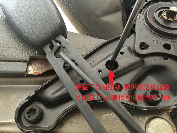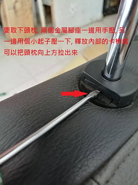 再來就是要拆頭枕的部分, 頭枕先把卡榫壓住昇到最高, 再來把沒有卡榫的那側用一個螺絲起子壓住隱藏的卡榫就可以把整個頭枕拉出來,請看下面的照片: