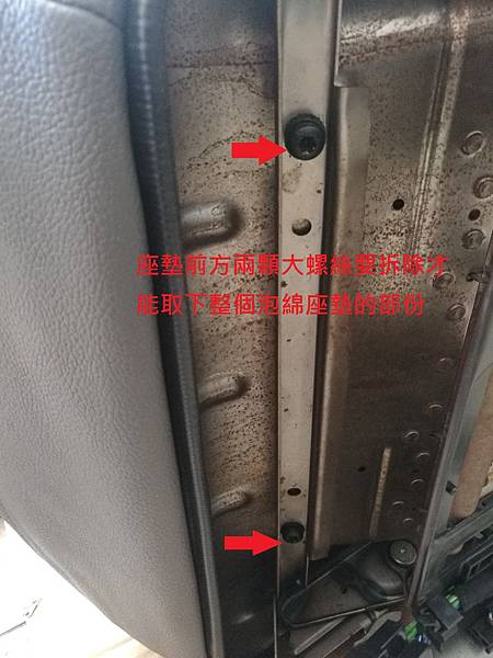 左右兩邊拆下來之後,在前方有兩顆大的螺絲是固定這個泡棉坐墊的部分 , 請看下面的照片: