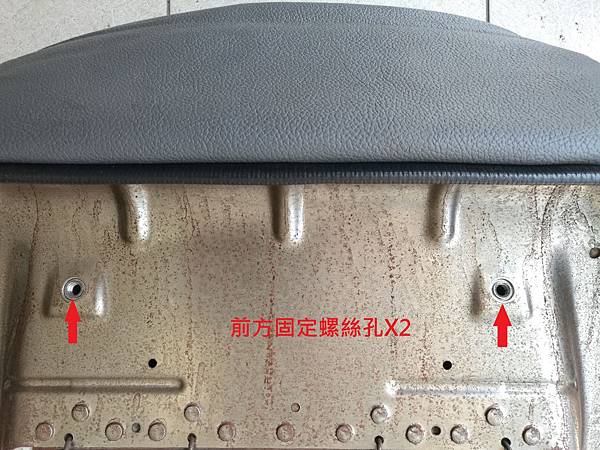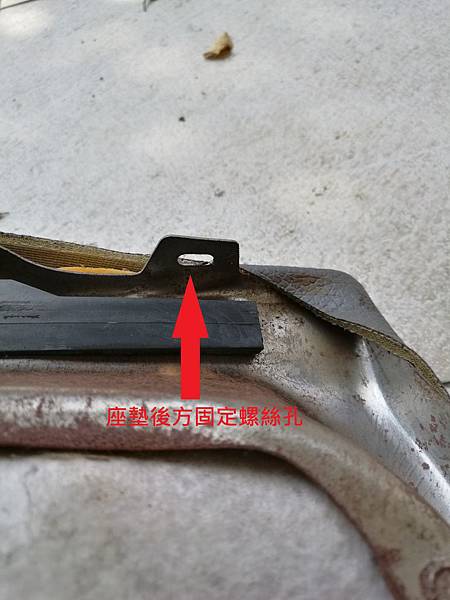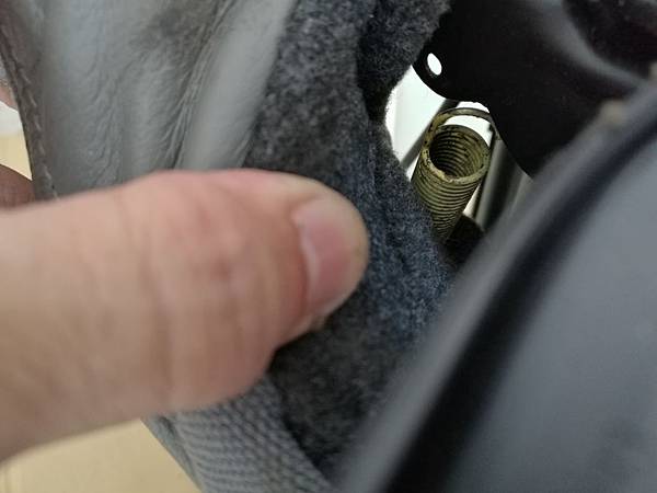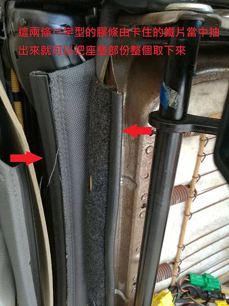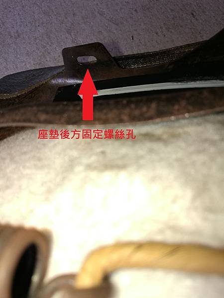 這兩個螺絲拆掉之後, 在把坐墊後側有兩塊皮面,一塊用膠條固定在下方,另一塊皮面也是用膠條勾住上方鬆開之後應該就可以把整個座墊的部分整個取下來, 請看下面的照片: