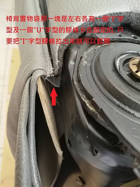 我有特別把四個固定螺絲的位置標示出來,這樣大家要拆的時候比較清楚相對位置, 座墊部分拆完之後再來就是要拆椅背的部分, 椅被的部份要拆先由後面置物袋左右兩側開始拆,他是用兩條膠條互相卡住,把膠條拉出來之後就可以把整個椅背的皮面掀開來, 請看下面的照片:
