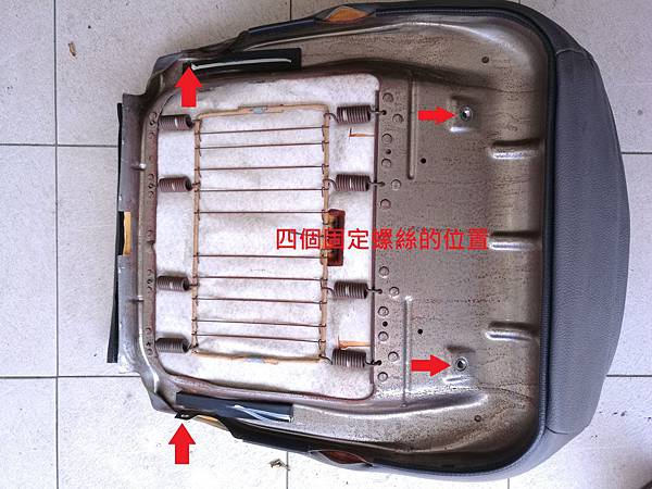 可以看到手動座椅的下面有一個固定連接器的鐵片,這個部份要拆掉,其他的尺寸是完全一樣的,因此可以直接整個皮面及泡綿墊互換過去, 要互換裝回去就是反向動作,這邊就不詳細說明了,只是在安裝的時候要注意有一些固定的彈簧要卡好不要漏掉了, 請看下面的照片: