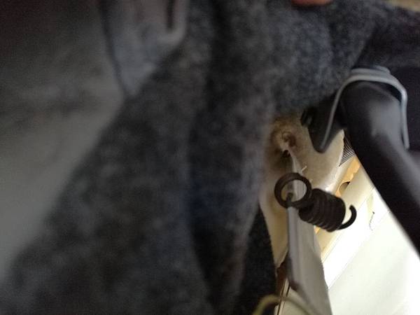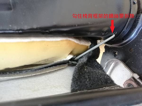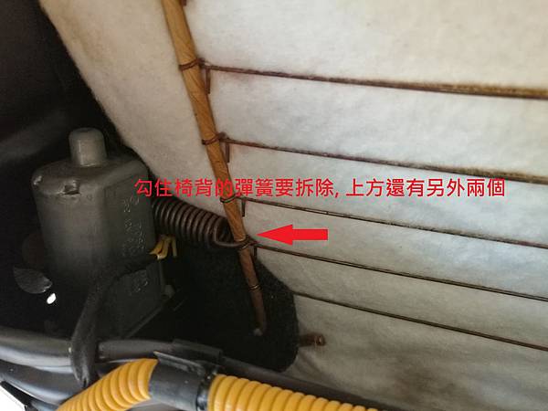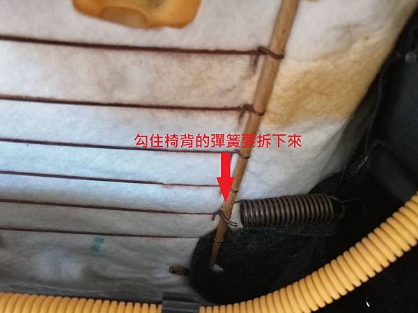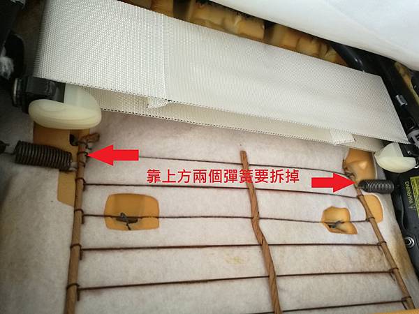 頭枕拉出來之後整個椅背的泡綿及皮面就可以向上掀起來,要掀開之前左右兩側的彈簧要先拆下來, , 請看下面的照片: