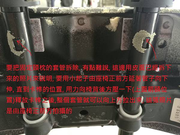 鬆開之後整個皮面就可以向上掀起來了, 掀開到最上面要把固定頭枕的兩個塑膠圓筒狀的套管拆掉, 他的設計是有個小卡榫卡在椅背支架的金屬管上,要由座椅正前方用一個小起子往下探,到了卡榫的那個缺口用起子往下壓,讓卡榫釋放之後就可以把這個圓桶裝的塑膠管向上方拉出來, 這個用文字比較難形容請直接看照片吧, 這照片是拆掉後才拍的, 沒拆之前很難拍到這個部份: