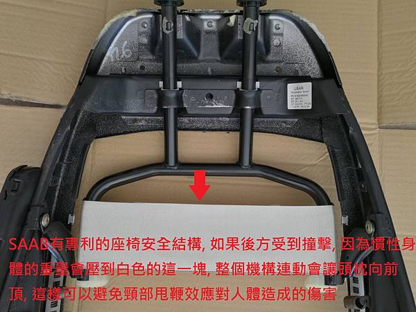 拆開後就可以看到SAAB專利的座椅安全結構,這個結構當後方受到撞擊的時候會把頭枕往前推這樣就可以避免頸部甩鞭效應對人體造成的傷害, 請看下面的照片, 就椅背中央白色那一條還有機構聯動到頭枕的套管 :