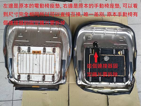 接下來要把泡棉座墊及椅背的部分互換, 下面這張照片是手動座椅及電動座椅的座墊部分, 請看下面的照片: