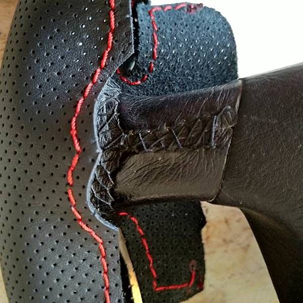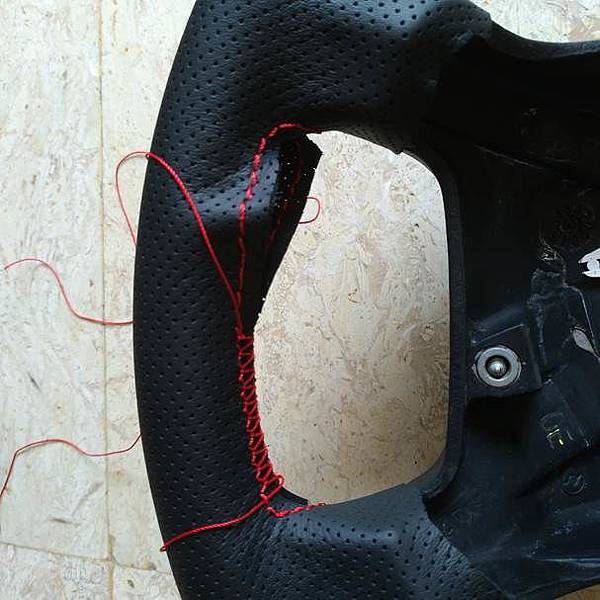 水平的那條會在之後縫方向盤內圈的時候縫起來,四個突出部的背面縫好之後就可以開始縫方向盤的內側,先由下方開始,先估算一下縫線的長度,大約3~3.5倍的直線距離,看縫的時候線拉得多緊,把縫線穿過皮面旁邊事先縫好的線上,這個點要選每一段的中央比較好,然後打個結,左右線要留夠,然後就可以開始縫了,縫的時候線不需要穿過皮革,只要穿過事先縫好的線段中央就可以,看照片比較容易了解我在說什麼: