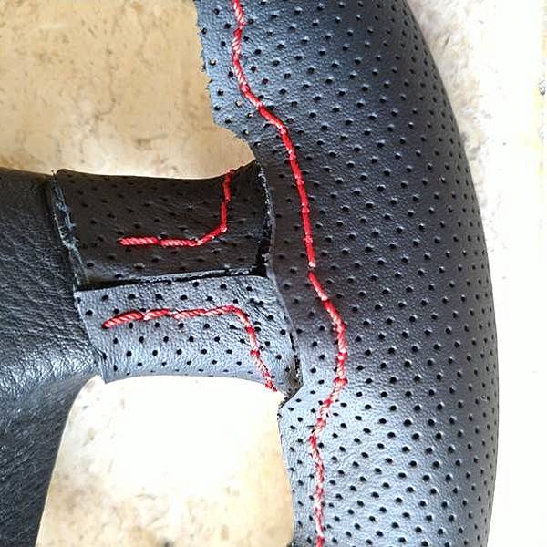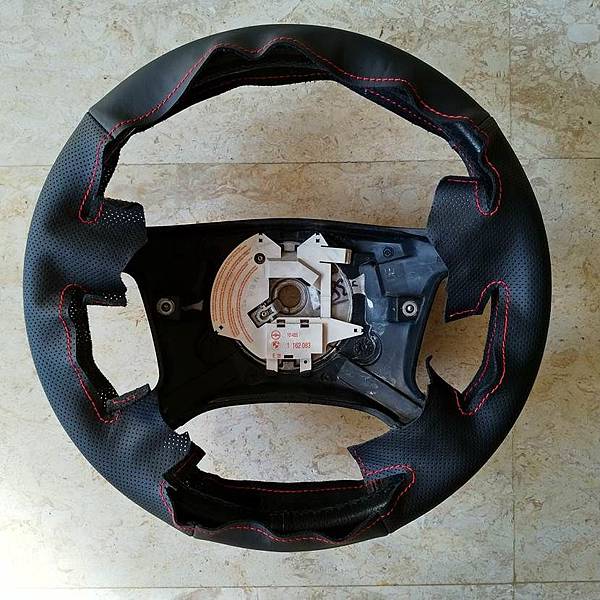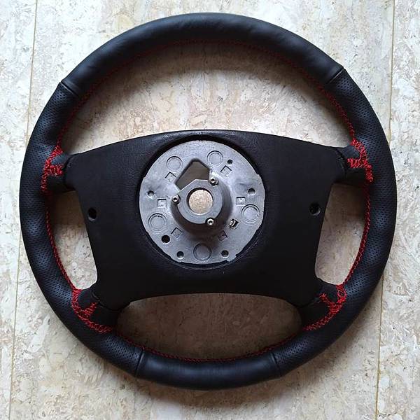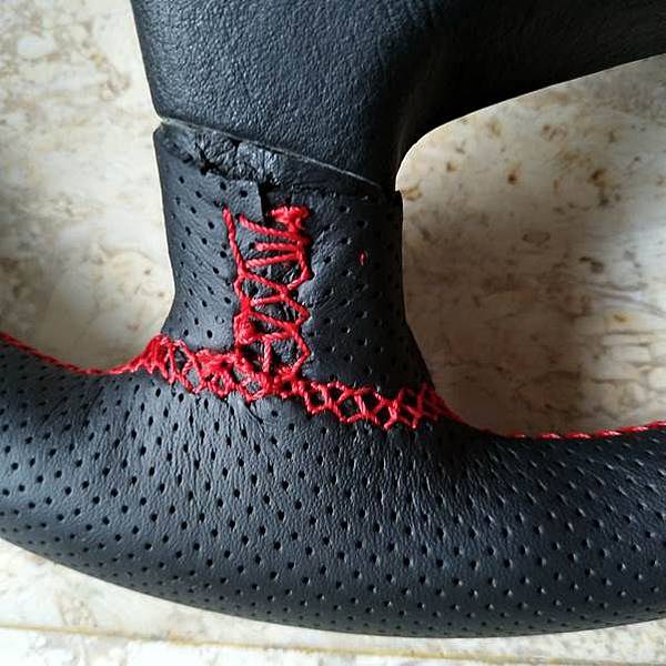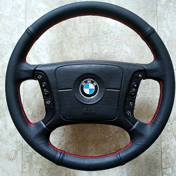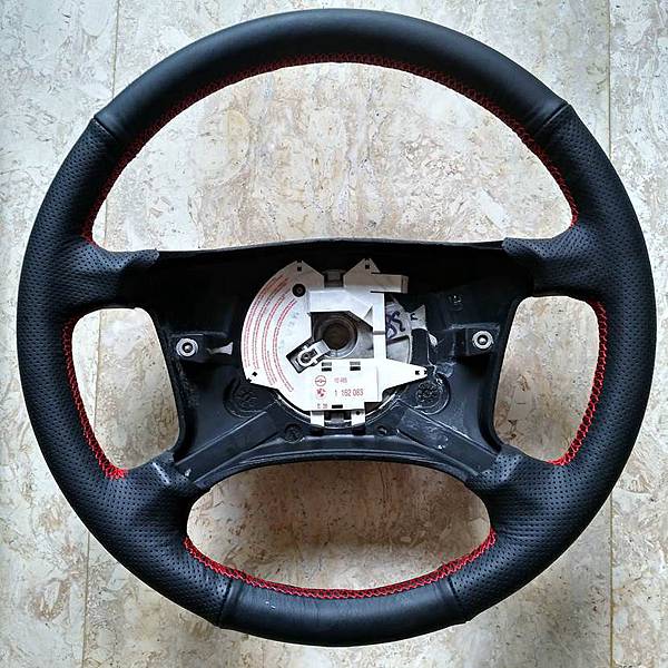今天的DIY課目是縫方向盤外面包覆的皮面, 之前有空的時候常常跑回收場,因此拆了不少E38的方向盤,而這些方向盤通常皮面的狀況都不會太好,如果真的要拿來使用,皮面更換是有必要的, 前一陣子再另外一個FB社團上有看到車友在賣方向盤的外皮,但是包覆的動作需要自行DIY,因此就買了一個來試看看,下面就把包覆的過程做個說明,首先把整個外皮包覆到方向盤上面,請看照片如下: