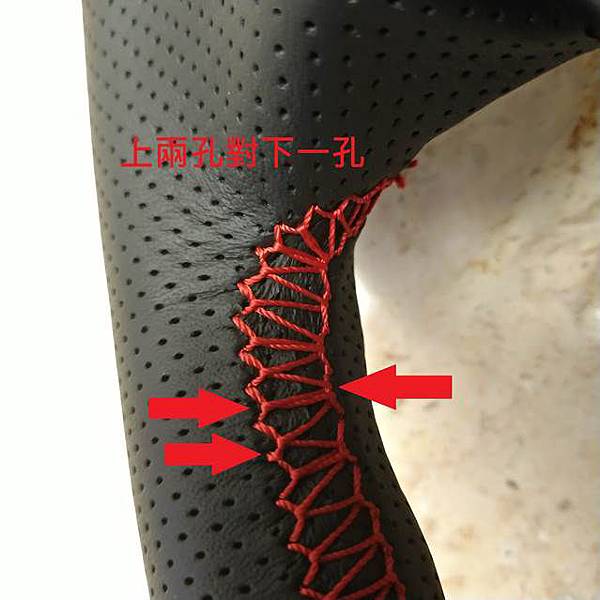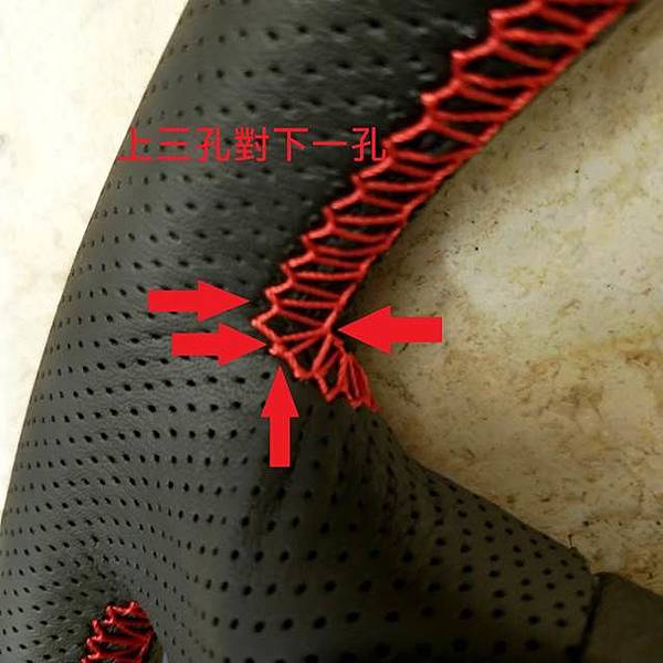 要注意縫的時候要把線拉緊,在皮面包覆完整的狀況下,要讓縫線的區域寬度盡量寬度一致,這樣看起來比較賞心悅目一點,通常在縫的時候是一個孔對一個孔,但是到了突出的四個幅條因為縫合的區域要轉到背面因此這個部份有時候下面的一個孔要對應上面的兩個孔或是三個孔,如此縫線的區域才能轉彎,這部份要縫的當下來做判斷,可以看照片比較清楚一點: