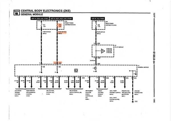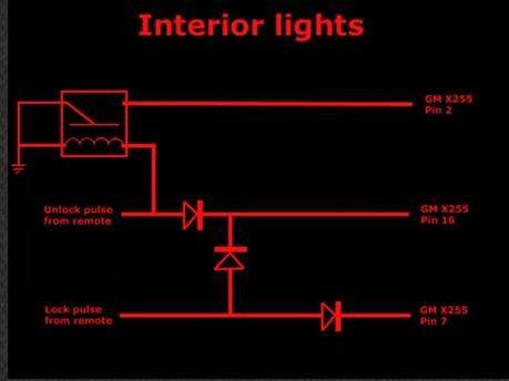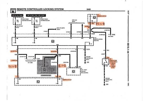 線路確定要如何接之後要來查一下BMW E34原廠的線路, 同時驗證一下接法是否正確, 首先看一下最重要的上鎖解鎖及室內燈的訊號, 這三根都在GM 模組上, 請看下面的線路: