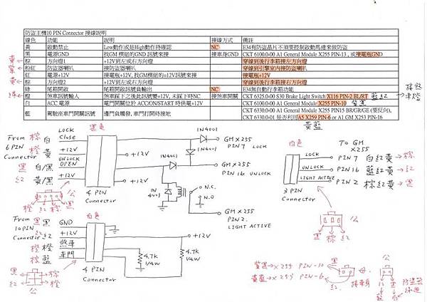 另外防盜器模組上面6 Pin的中控鎖訊號也須要接一點額外的線路, 我把全部的接線整理在下面這張圖當中: