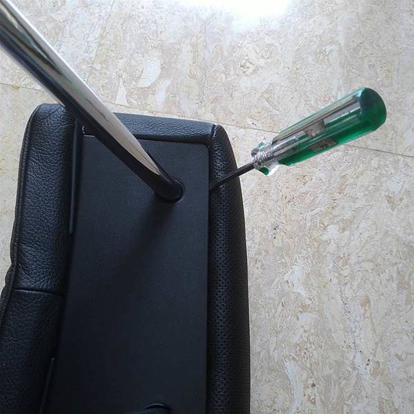 不知道大家還記不記得我的B12前座的兩個頭枕已經更換為E65/66的頭枕,不過這兩個頭枕一直有個問題,就是前面那片可動的部分往前拉之後沒有辦法固定,這個問題上週小謙大有給了一個解答,因此這一周就把我的頭枕整理一下,下面有許多照片是延用小謙大分享的照片,感謝小謙哥的分享,另外部份照片是我拍的, 所以有兩種頭枕的顏色, 首先要把頭枕拆開,第一步把頭枕由座椅上取下來,直接用力往上拉就可以,調整前面可動部份先放平,然後翻過來用的螺絲起子在頭枕的兩側把塑膠片往上翹,大家可以看一下照片: