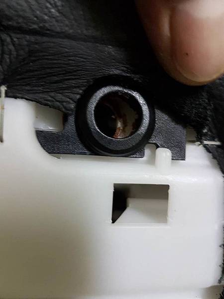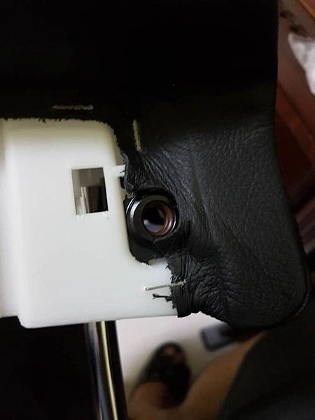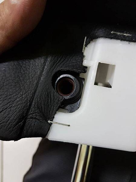再來就是要處理可動片沒有辦法固定的問題,大家可以看到在頭枕本體的左右兩邊有一個黑色的零件,這兩個黑色的零件向上推之後就可以取下來,取下來之後可以看到在圓孔的周邊有類似海綿的東西,不過已經老化分解掉了,起看照片: