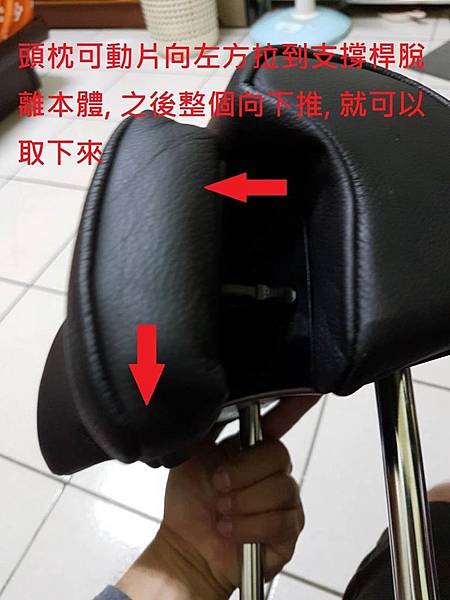 這時候用個斜口鉗把這個塑膠條突出的部份剪掉,之後就可以把頭枕兩側的支撐桿拉出來了, 頭枕兩側的支撐桿拉出來之後就可以把前面的可動片向下推,就可以把頭枕前半的可動片取下來,請看照片如下: